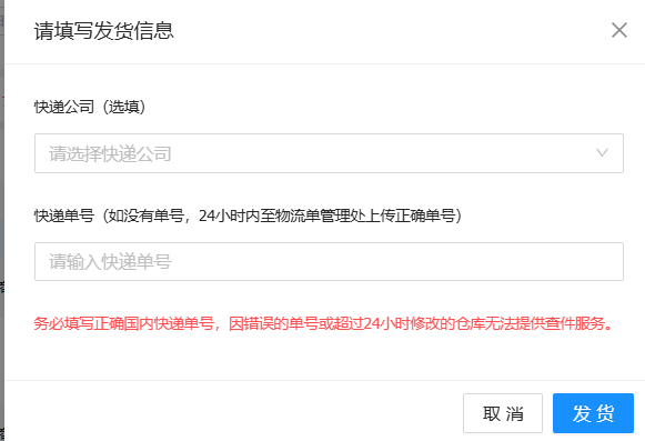 2.2点击发货后,选择国内快递公司及快递单号,点击发货。(如没有国内单号,可先不填,操作完成后可至物流单管理处)