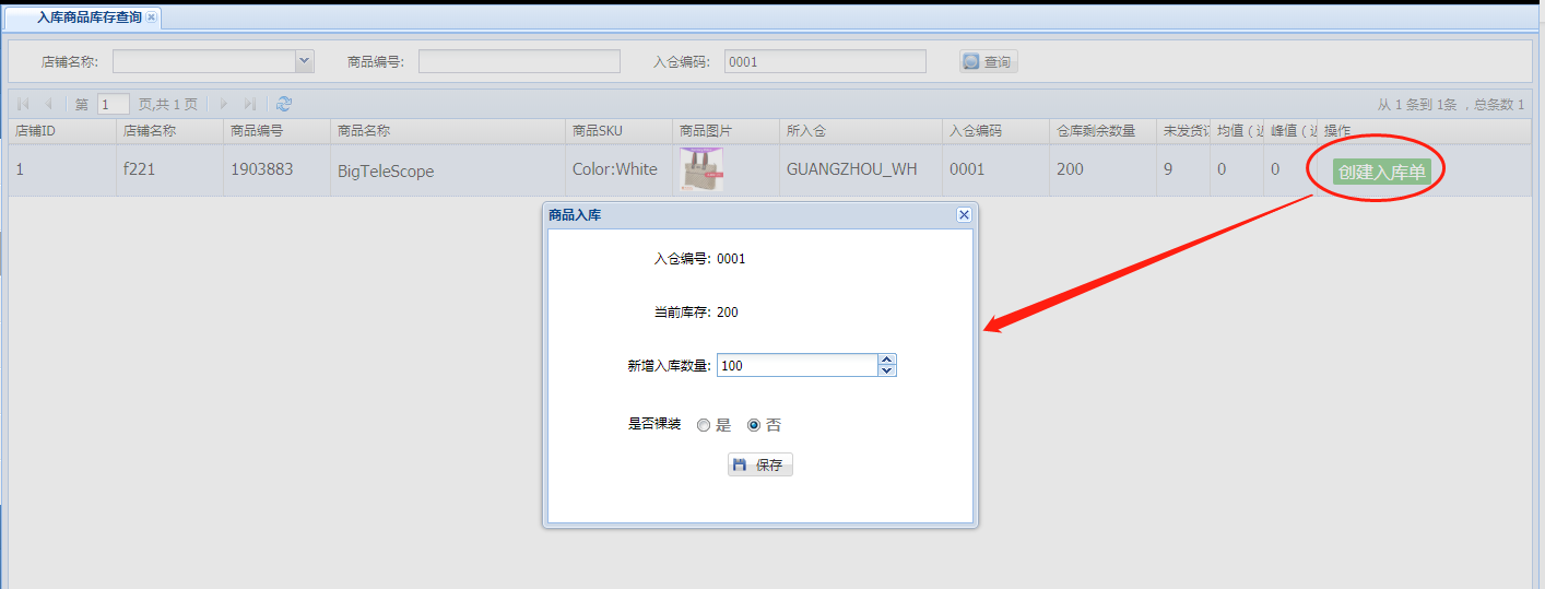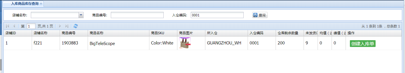 2、通过商家后台系统的【入库商品库存查询】功能查询到入库商品