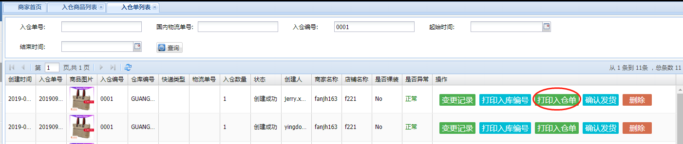 5、打印【入仓单】,并将入仓单张贴在每个物流包裹外包装上