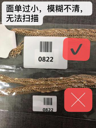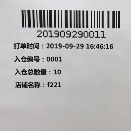 4、商品在入仓时,入仓单,入仓编码都正确,但入仓编码条形码模糊不清,纸张过小,导致无法扫描,需要仓库重新打印粘贴后才能扫描(现场会提供图片给运营传达给商家)如图: