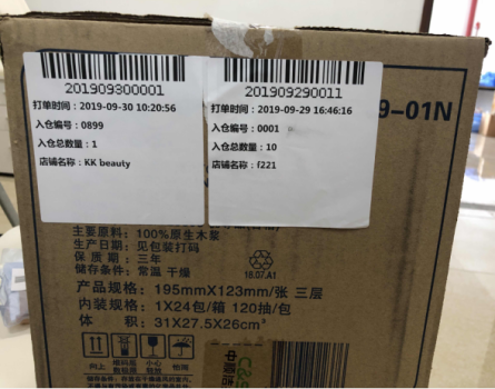 2、商品在入仓时,外包装有入仓单,但包装内商品无粘贴入仓编码条形码,需要仓库核实后才能正确入库。如图: