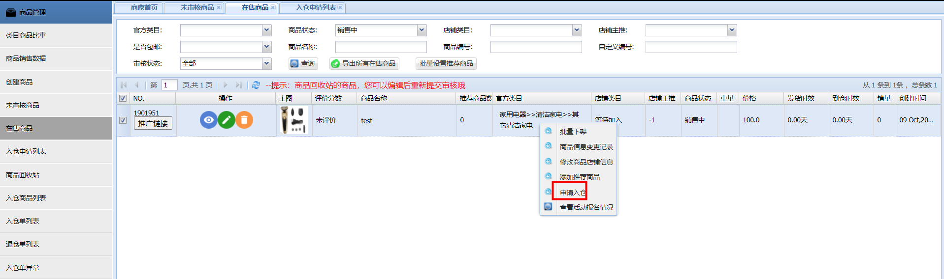 在售商品列表中选中需要入仓的商品,右键选择申请入仓,选择要入广州仓库的商品sku,点击申请,等待运营审核。在【入仓申请列表】中查看运营审核状态;