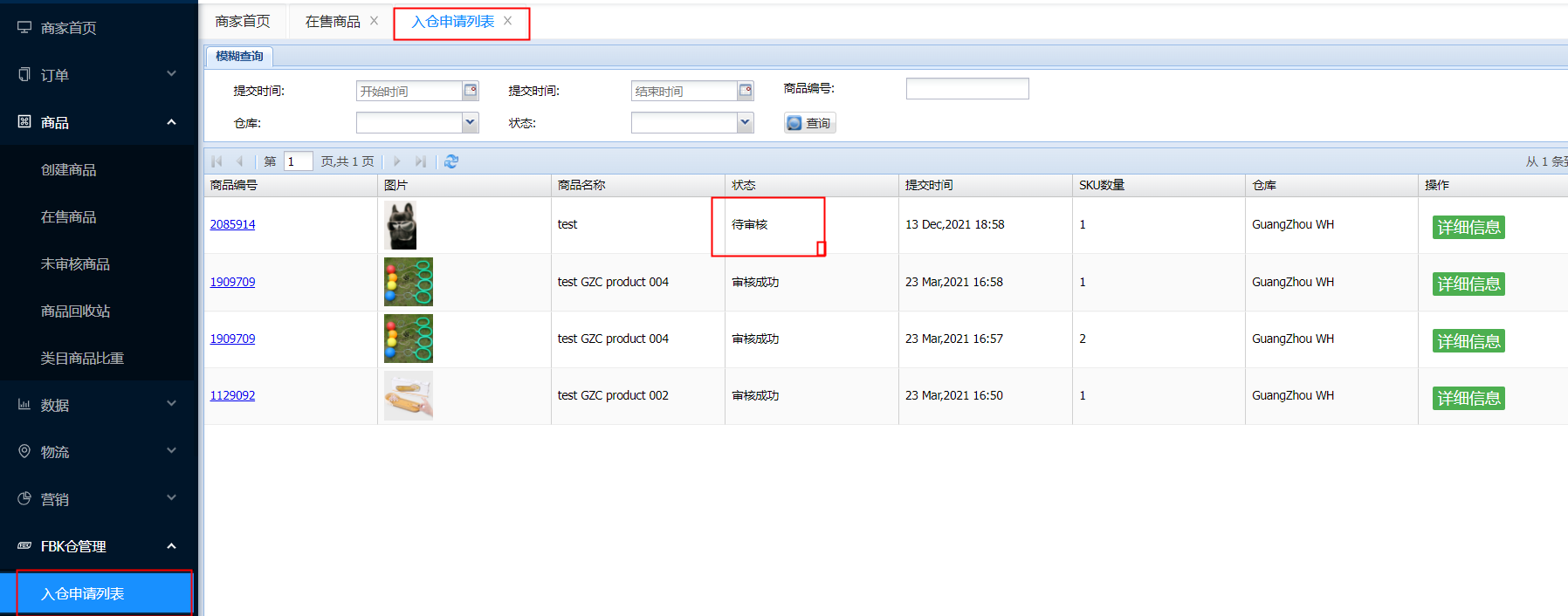查看审核结果可在【入仓申请列表】中查看审核结果
