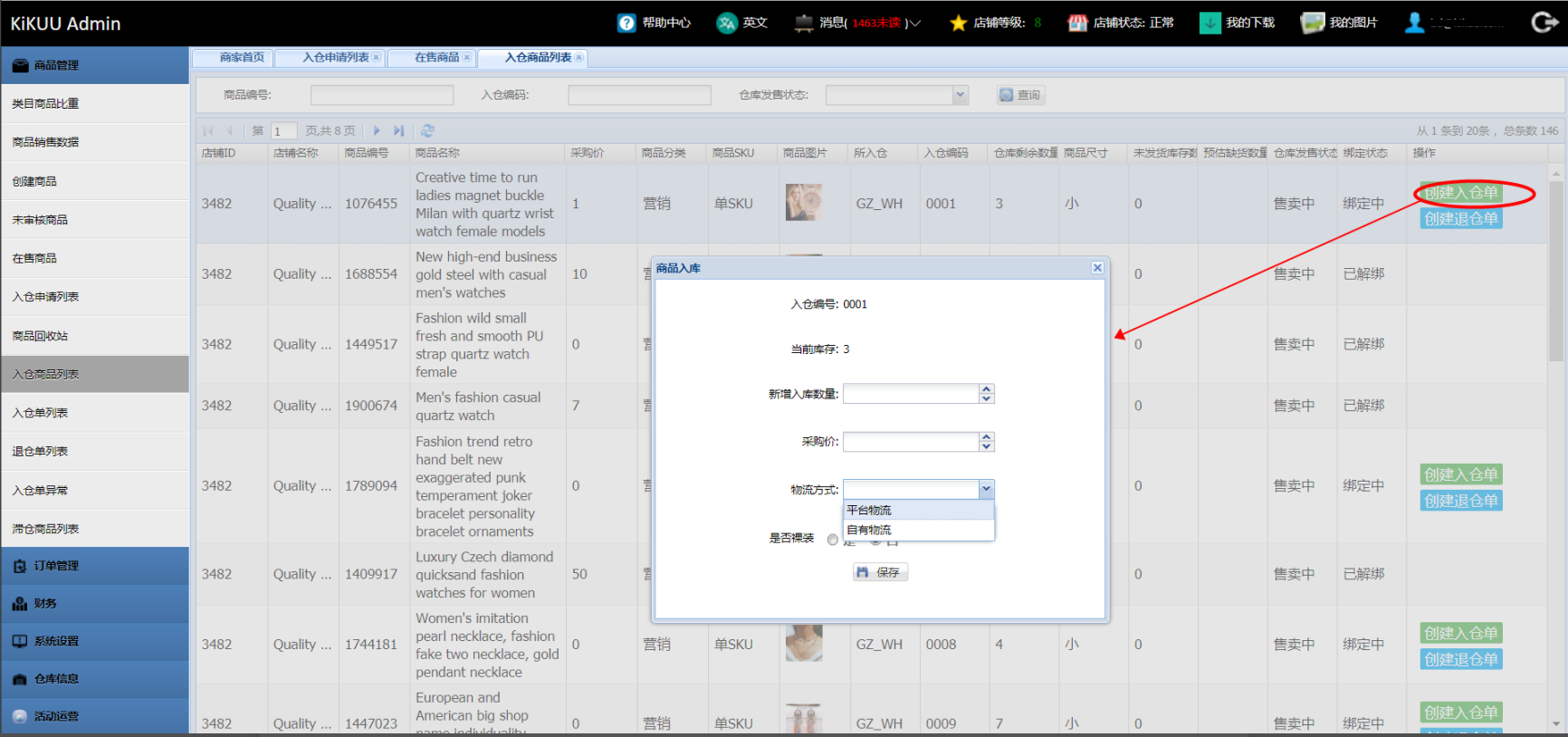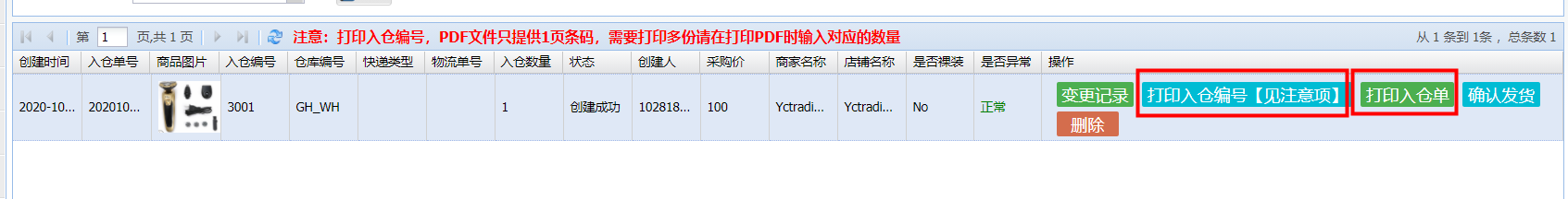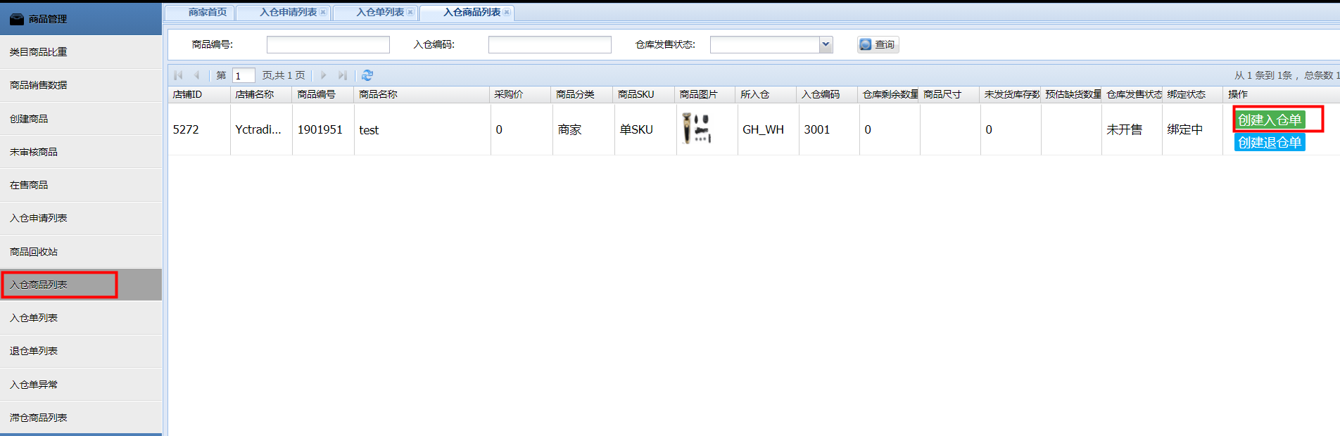 【入仓单商品列表】中,找到相应商品,点击创建入仓单