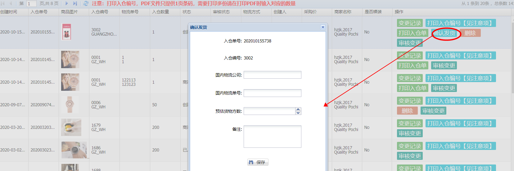5、发货后,后台点击确认发货,并填写对应的国内物流信息以及预估货物方数(可随便填写)。