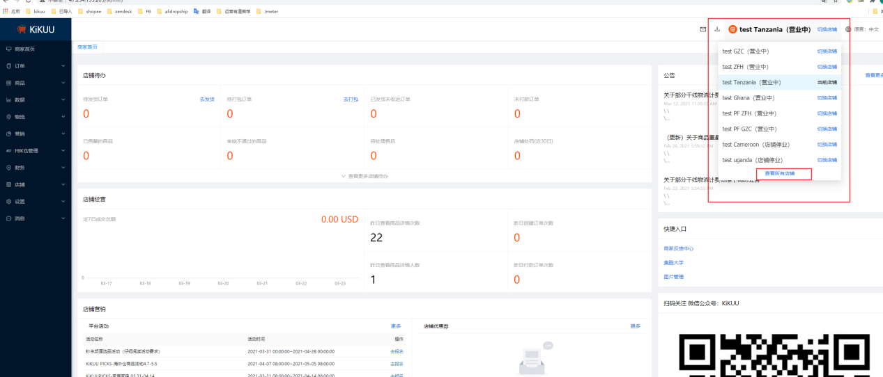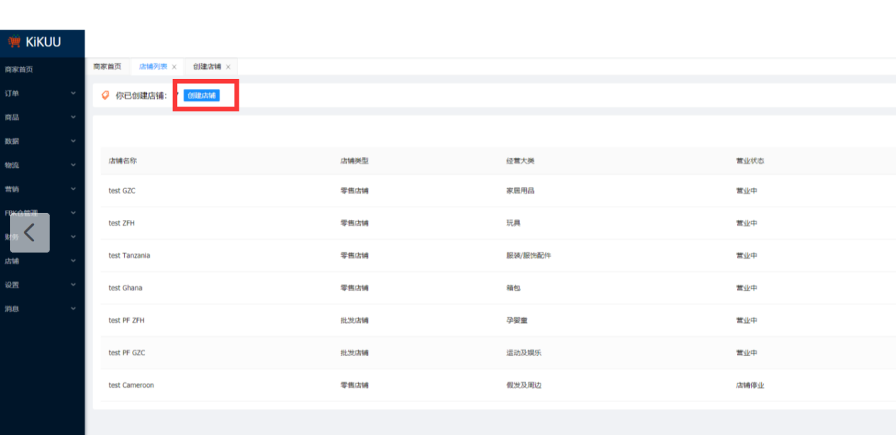 1.打开KiKUU商家后台,点击右上角商家账号-查看所有店铺(新申请账号商家请直接点击创建店铺)