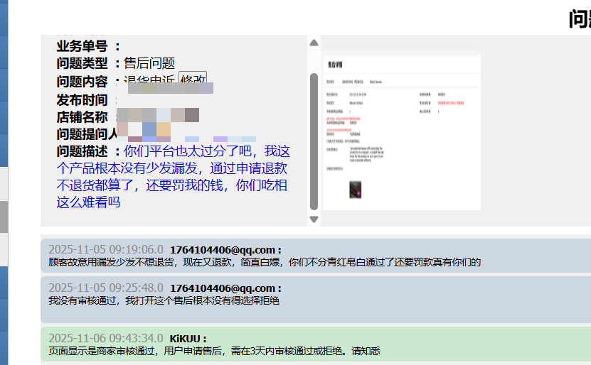 正确反馈:订单号*****,因商家原因未及时审核售后,用户原则错误的售后理由,特申请退回因少发漏发错发导致的保证金扣款,请平台处理。